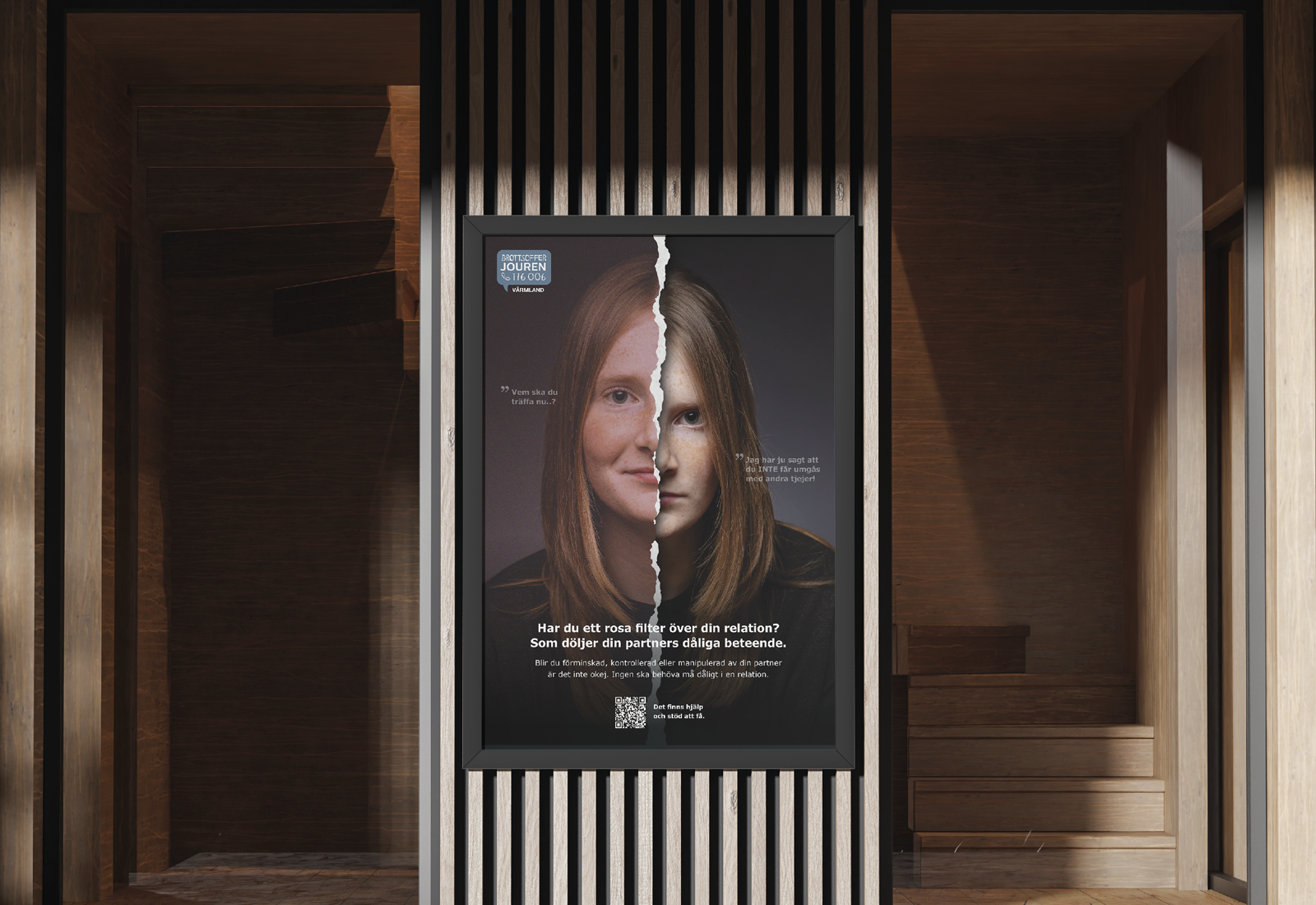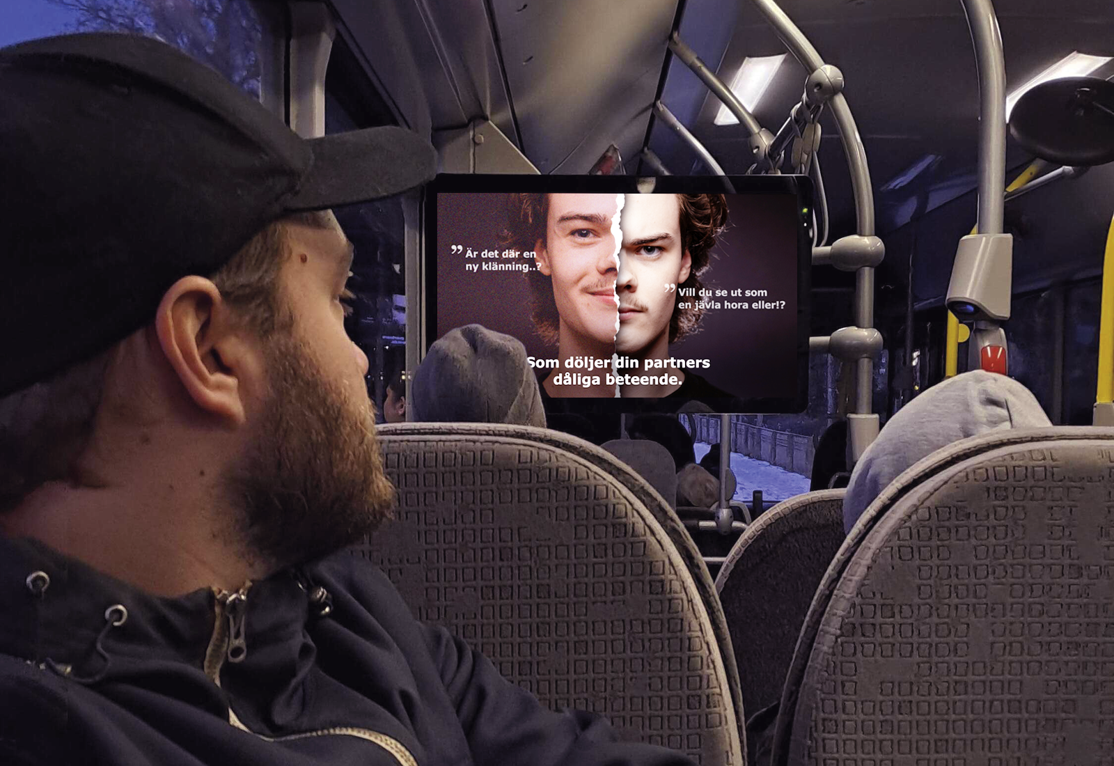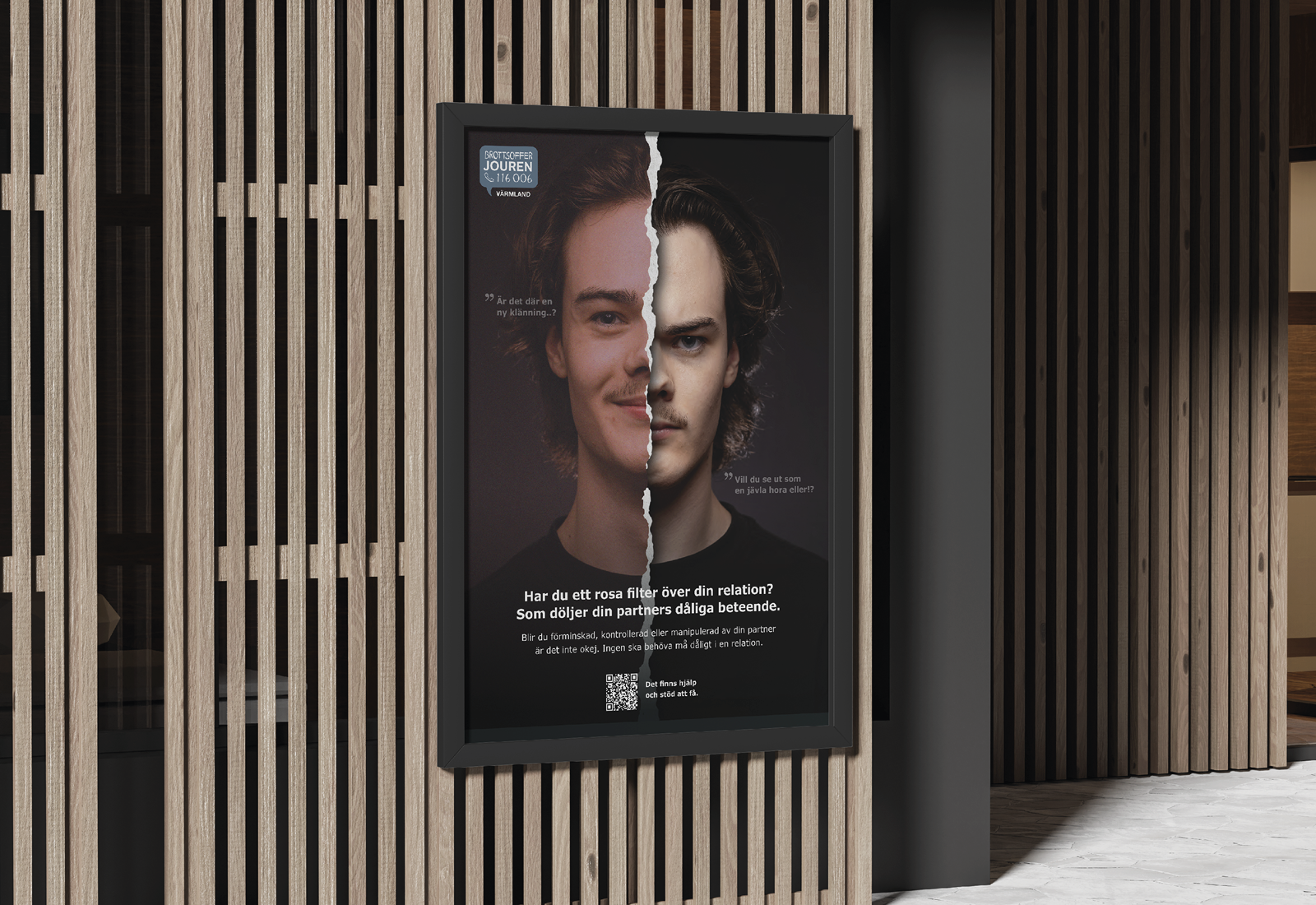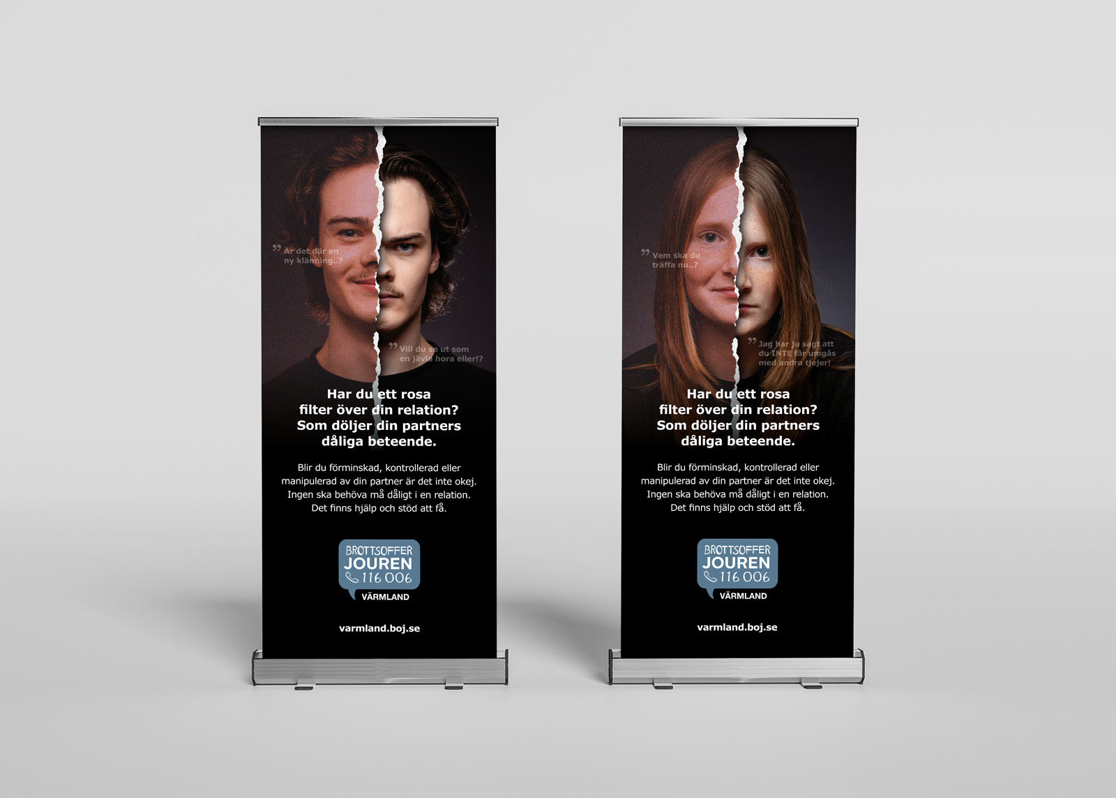 För kampanjen tog vi fram två filmer, en där en tjej är utsatt och en där en kille är det. Detta för att visa att alla kan utsättas för våld i sina relationer. Båda filmerna visades på sociala medier och på Brottsofferjourens egna webb. Vi tog också fram två rollups och två affischer, där affischerna även animerades för sociala medier samt buss-tv.